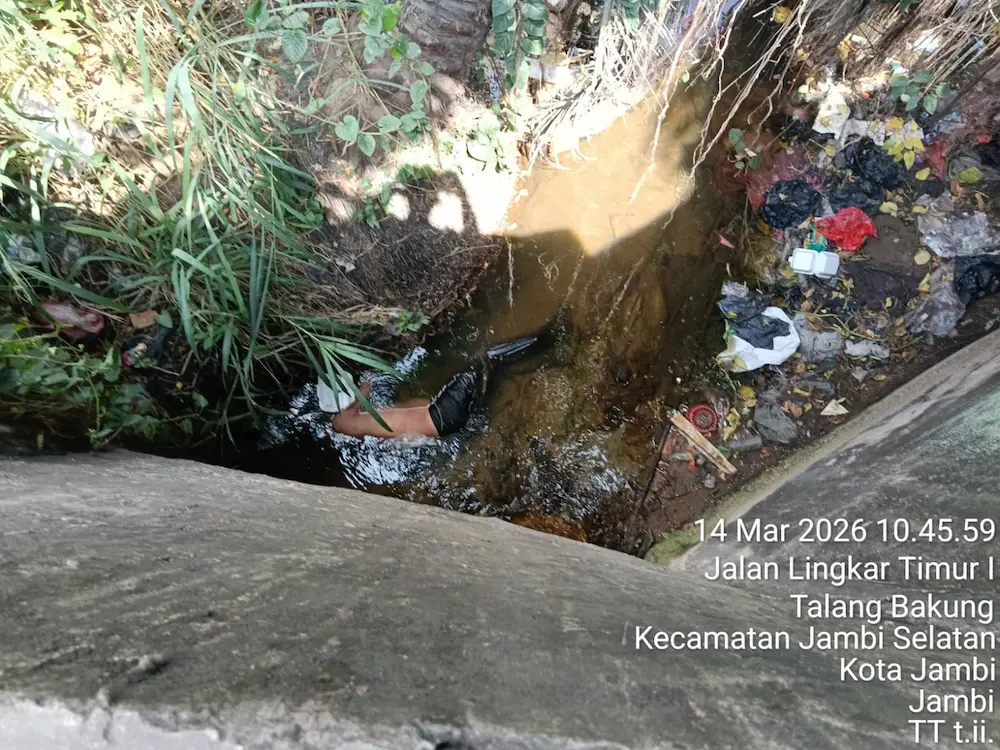 dottcom.id – Seorang pria tanpa identitas ditemukan meninggal dunia di dalam parit bawah terowongan aliran air sungai di Jalan Lintas Timur 1 RT 22, Kelurahan Talang Bakung, Kecamatan Paal Merah, Kota Jambi, Sabtu, 14 Maret 2026, sekitar pukul 10.30 WIB. Penemuan jenazah ini langsung mengundang perhatian warga sekitar sebelum akhirnya ditangani aparat kepolisian.