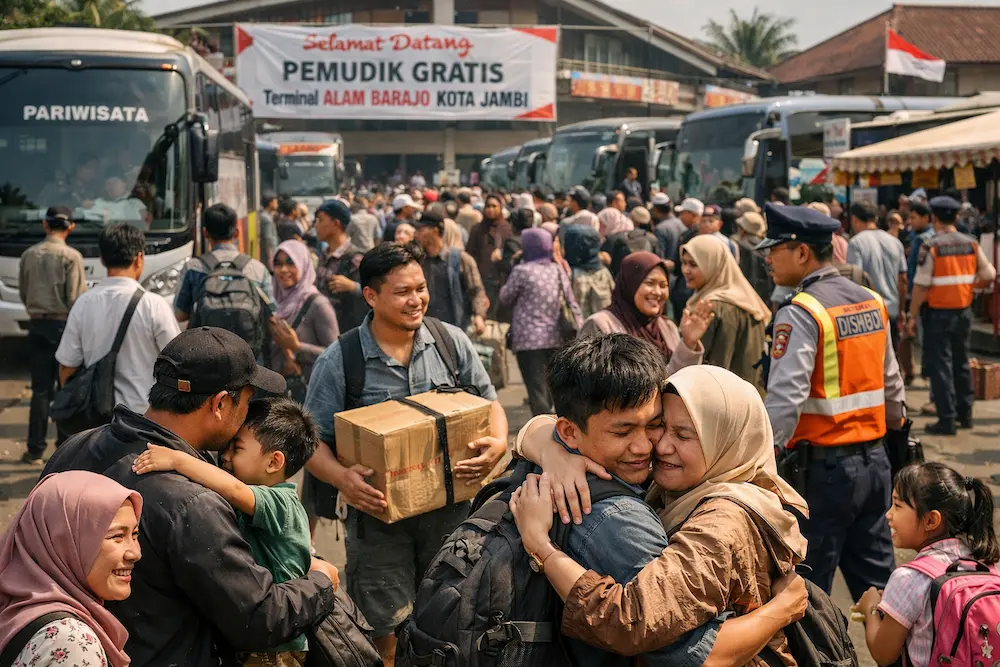 dottcom.id – Sebanyak 300 peserta program mudik gratis dari Jakarta tiba secara bertahap di Terminal Alam Barajo, Kota Jambi, Minggu. Kedatangan para pemudik sempat mengalami keterlambatan setelah perjalanan mereka terhambat kemacetan di Jalan Lintas Timur Sumatera, tepatnya di kawasan Bayung Lencir, Musi Banyuasin, Sumatera Selatan.