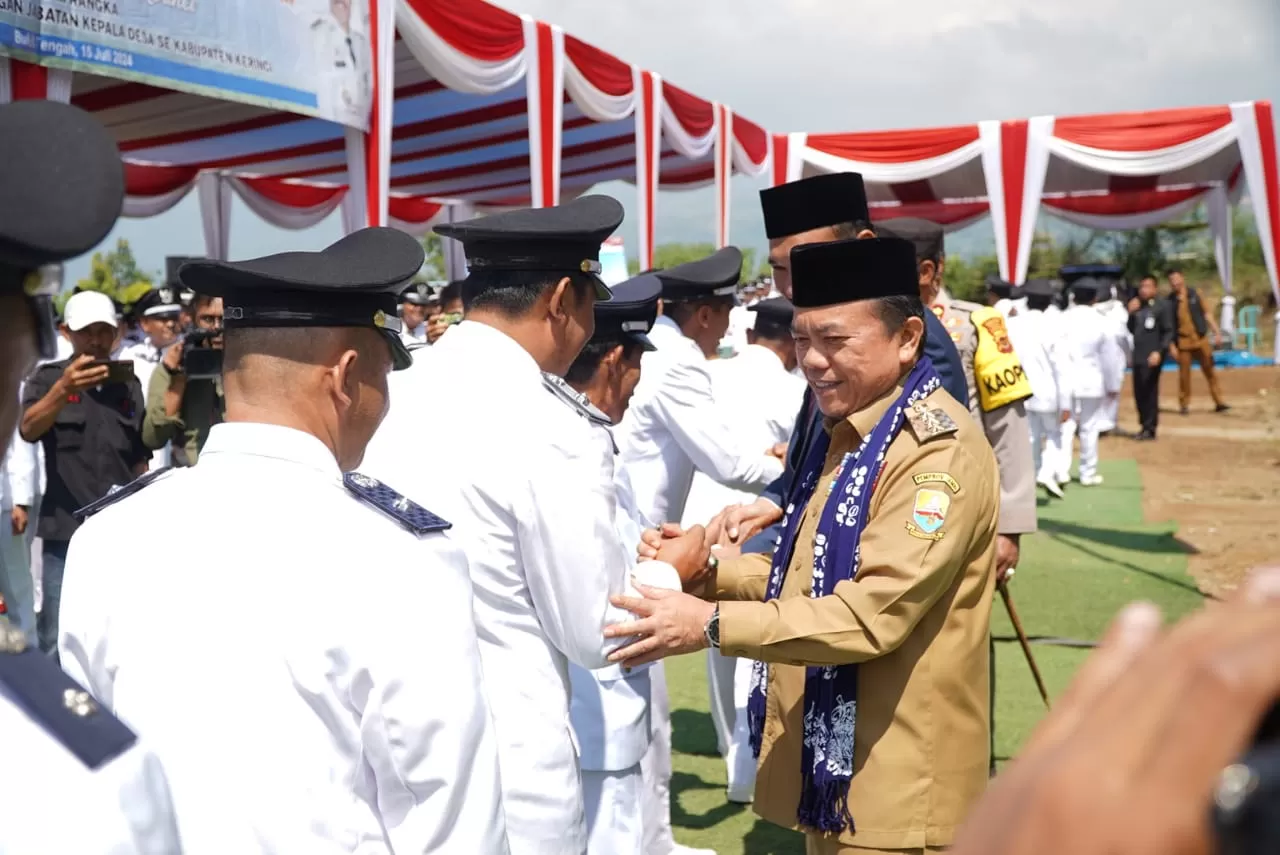 Pengukuhan masa perpanjangan 285 Kades menjadi 8 tahun ini berlangsung di Depan Kantor Bupati Kerinci, Bukit Tengah, Siulak Mukai, Kabupaten Kerinci, Senin (15/07/2024).
