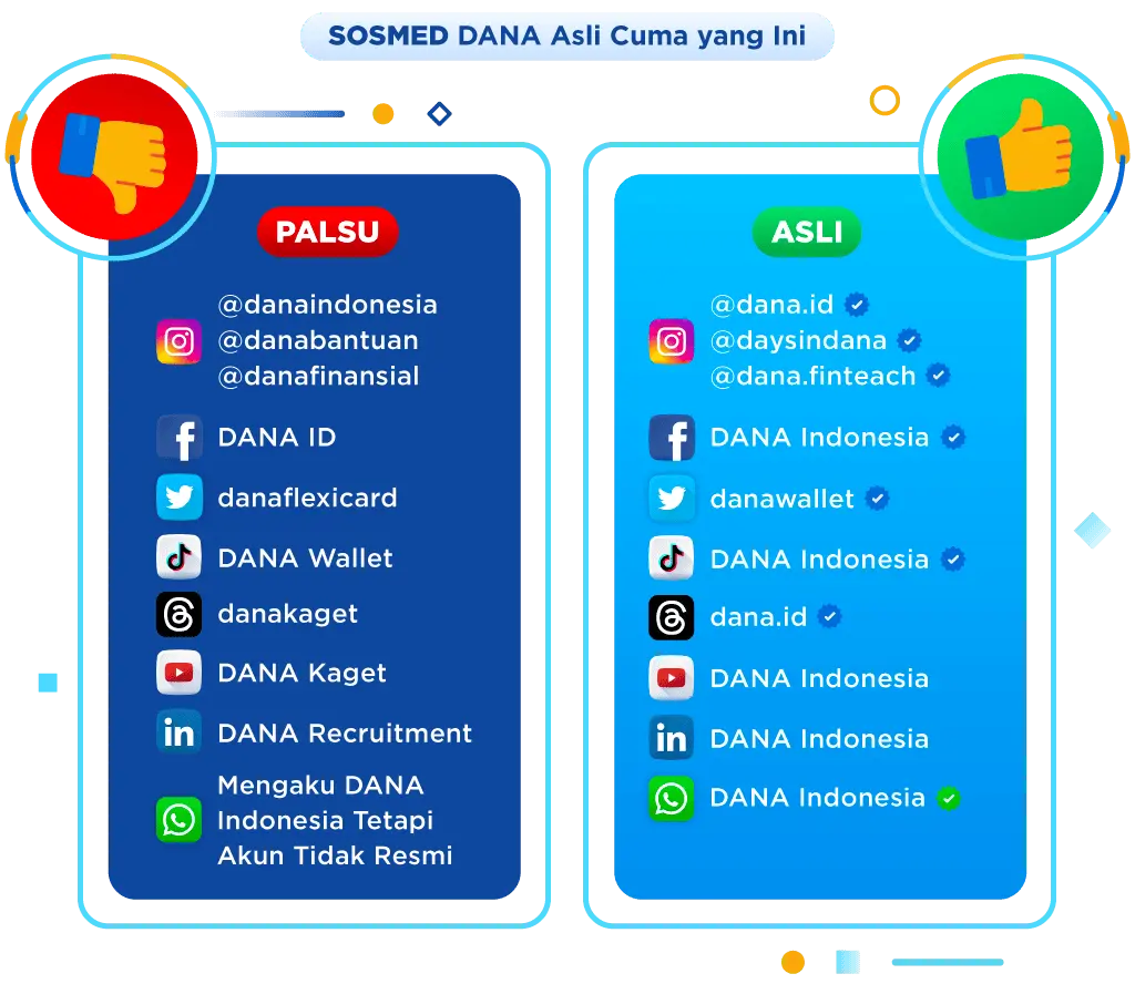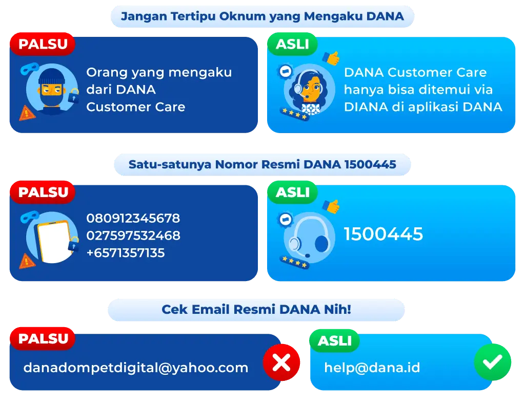 Jika ada yang menghubungimu, hati-hati ya! Pastiin dulu akun socmed, nomor, atau email yang menghubungi kalian resmi dari DANA atau bukan. Yuk cek kontak resmi DANA yang asli di bawah ini!