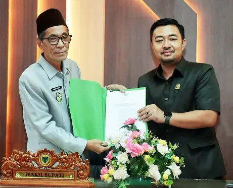 Ketua DPRD Batanghari Rahmad Hasrofi memberikan lampiran rekomendasi DPRD terhadap LKPJ Bupati Batanghari 2024 setelah Fernando Putra Rinaldhi membacakan rekomendasi tersebut.